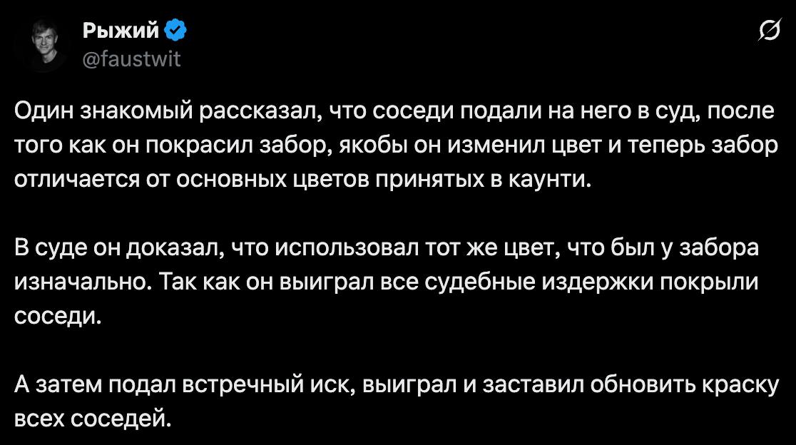 Мне кажется, твит на фото хорошо описывает, насколько пригороды США зарегулированы и как «формируется добрососедство». Как говорится, мем смешной, а ситуация страшная.