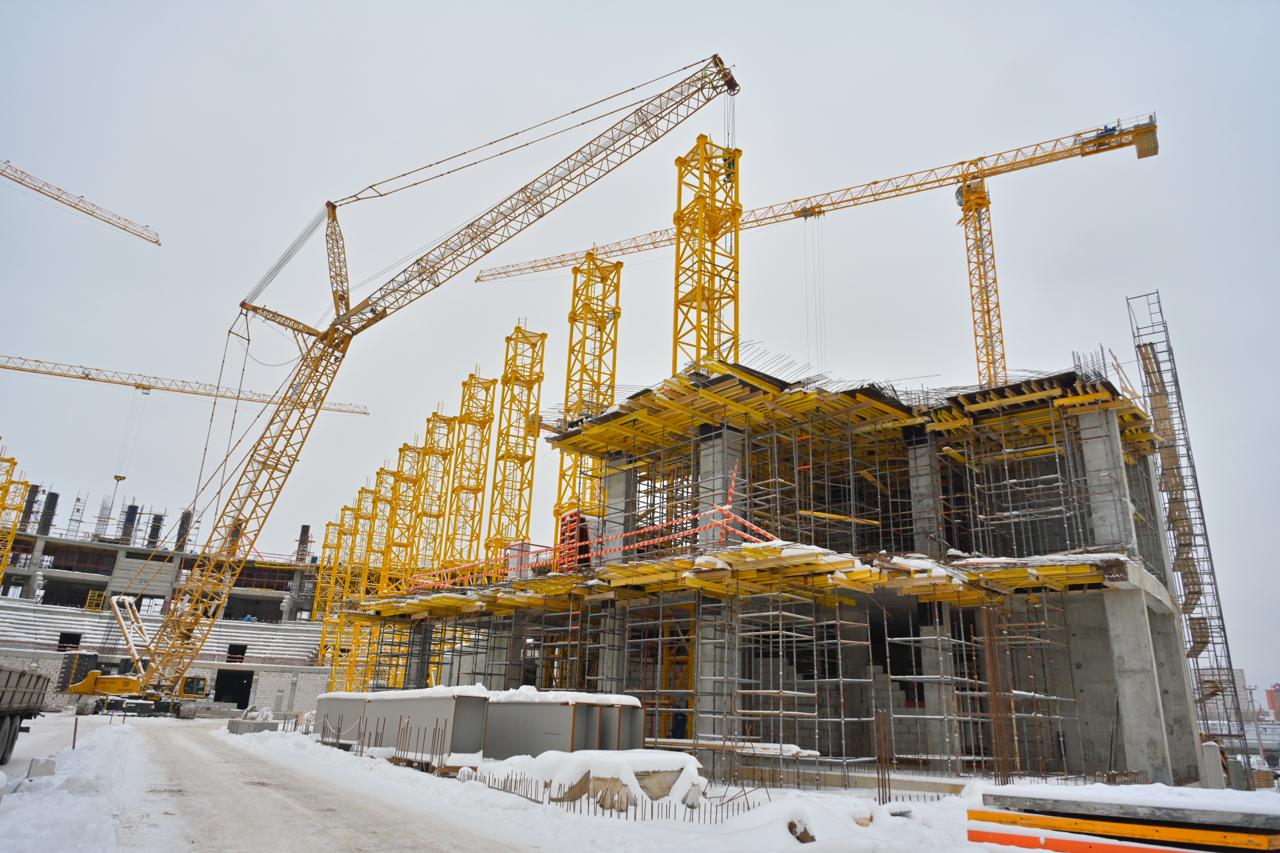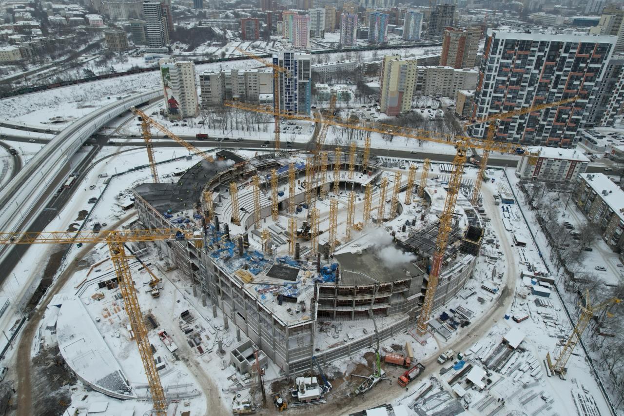 Параллельно продолжается строительство каркаса здания: работы ведутся одновременно на 2, 3 и 4 этажах. Почти достроен первый этаж, монтируем перегородки и готовим основу будущего купола — кольцевую опорную балку с самым большим пролетом 96 метров.
