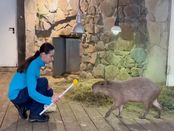 Сотрудники показали необычный зоо-тренинг. В кадре видно, как специалист прикасается к животному рывками. В руке она держит палочку с желтым шаром на конце – периодически сотрудница дотрагивается к меху капибары. На приспособлении есть скотч (липкая лента).