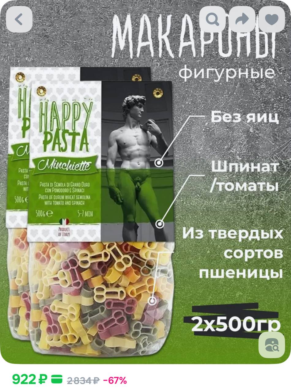 Макароны в форме членов завезли на Ozon — целый килограмм «болтов» можно купить за 922 рубля. Покупатели пишут, что они «не падают» при варке и отлично держат форму.